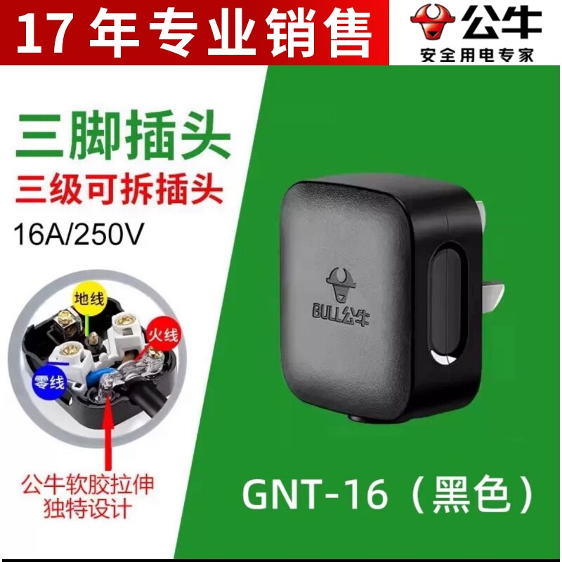 正品公牛插头16A三角脚插4000W空调插头热水器新能源插头T-16黑色