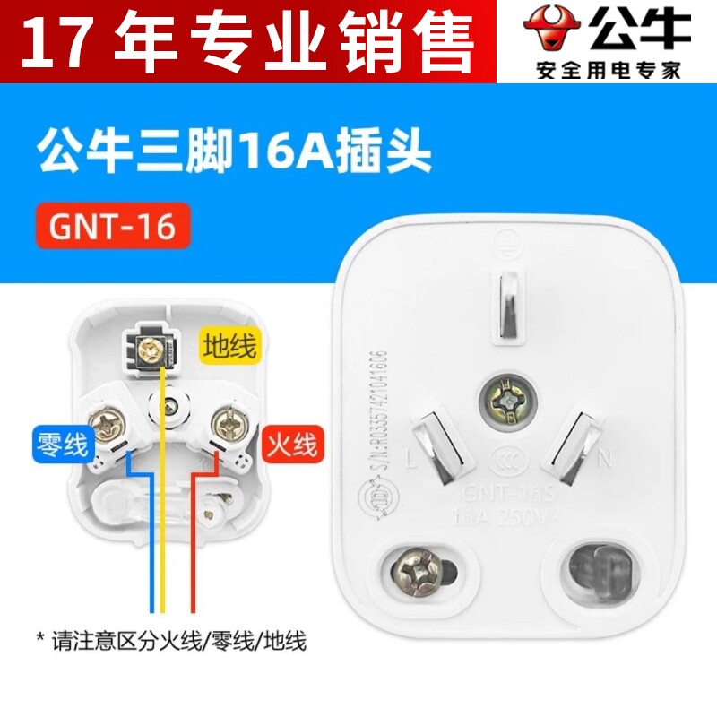 公牛大功率插头16A三角脚插4000W空调插头热水器新能源插头T-16S