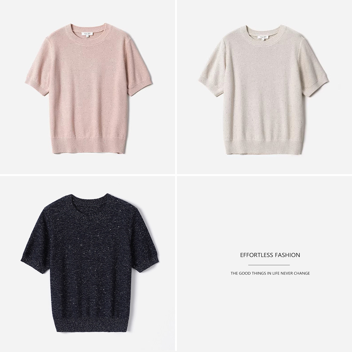 WZT08187 梦幻闪耀干爽透气亚麻棉珠片纱短袖针织套衫女