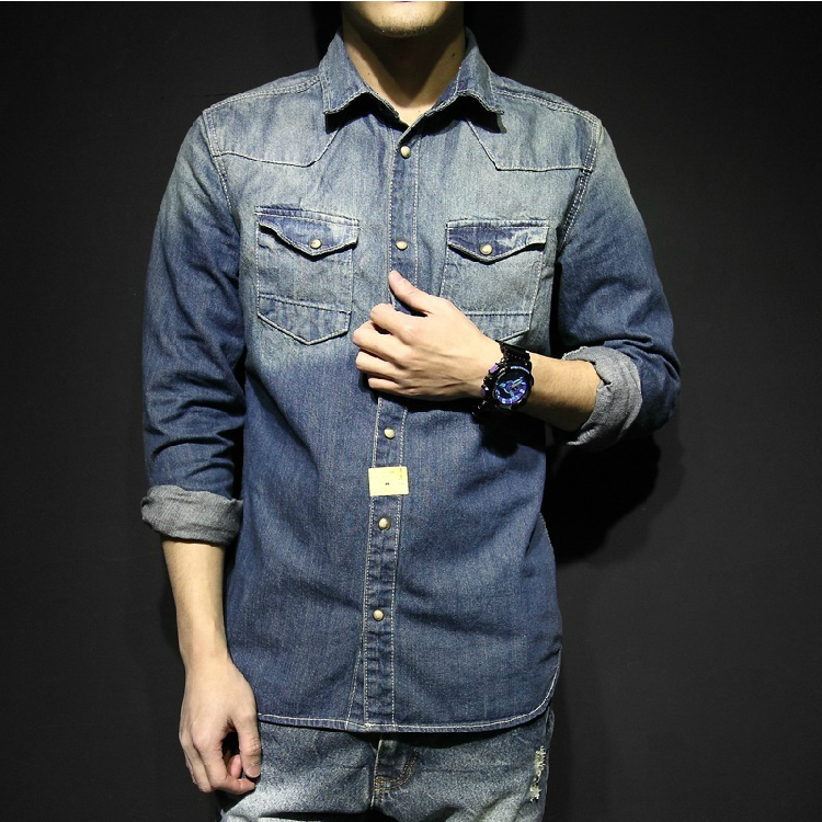 求围观 英伦复古宝石扣水洗做旧加厚修身牛仔衬衫 长袖衬衫男潮