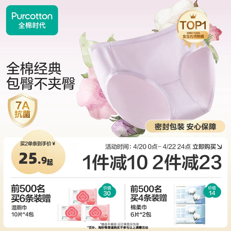 草本初色妇炎洁联名婴儿棉10A抑菌女士内裤中腰聚乳酸加长裆透气
