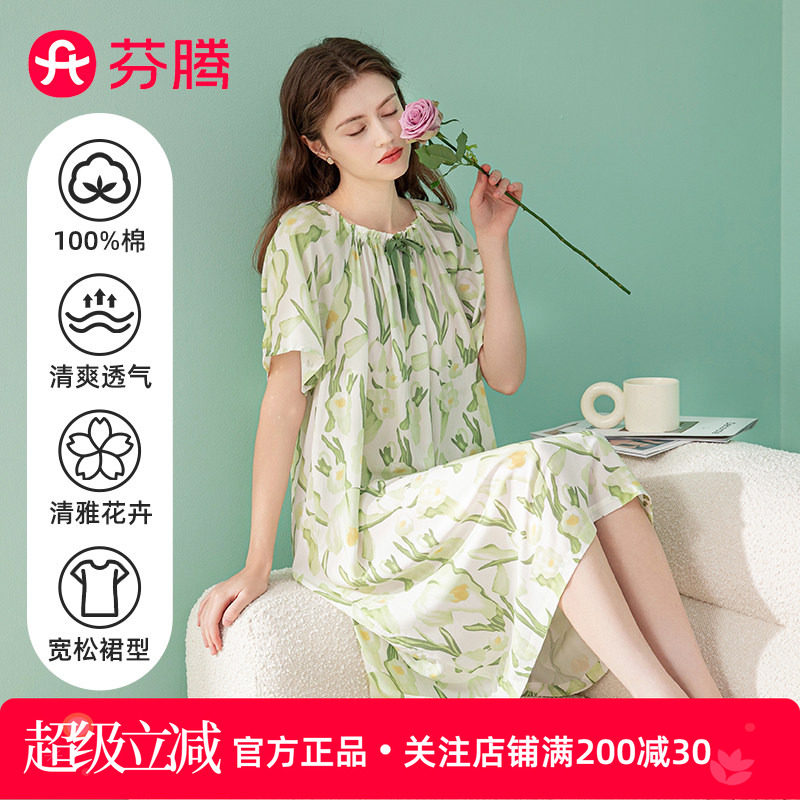 芬腾睡裙女士夏季薄款短袖纯棉大码可爱睡衣家居服全棉女款连衣裙