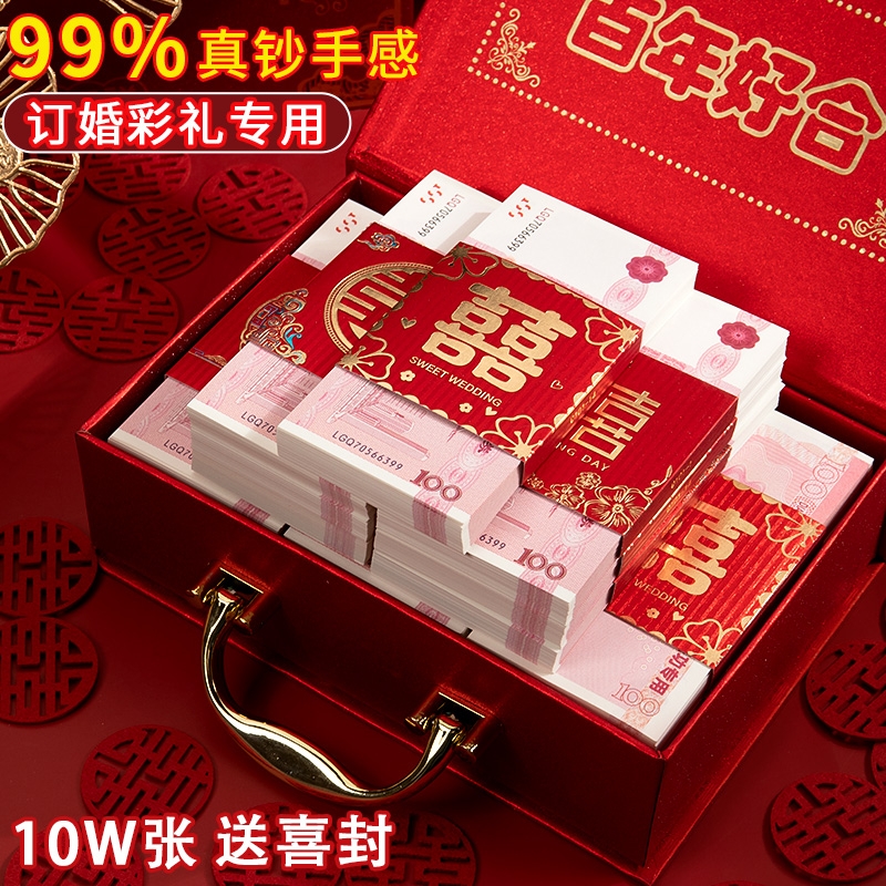 订婚彩礼假钱练功券道具100元人民币点钞券高仿婚庆用品摆件道具钞票十万现金道具钱封喜字钱套婚礼仿真礼金