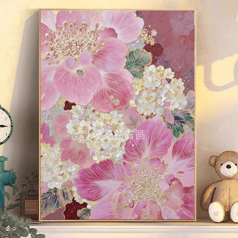 2025新款DIY手工贴钻点钻钻石画钻石绣竖版粉色花朵带钻的十字绣