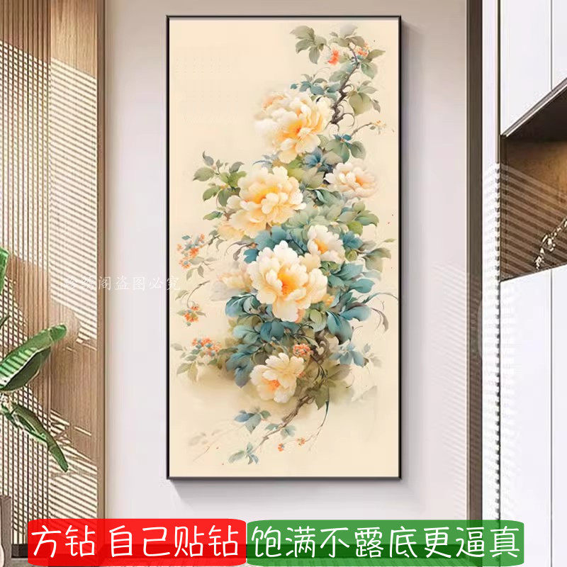 2025新款钻石画满钻玄关竖版花开富贵手工点钻十字绣牡丹砖石贴画
