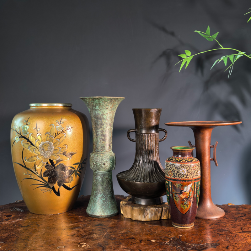 日本回流铜器嵌银铜瓶花器禅意花瓶摆件复古装饰日式插花花道7Y