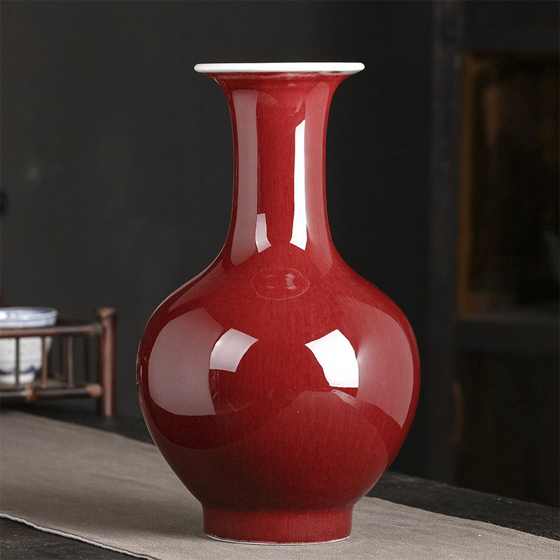 景德镇陶瓷插花中式禅意花瓶中式博古架摆件一对高端红色裂纹复古