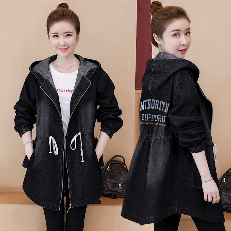 春秋新款大码牛仔外套女士中长款韩版胖MM黑色抽绳收腰显瘦风衣潮