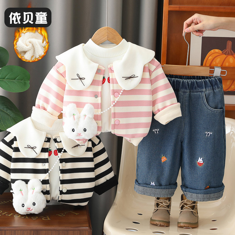 女宝宝0女婴儿童装衣服1冬装3岁女童2加绒洋气卫衣三件套装韩版潮
