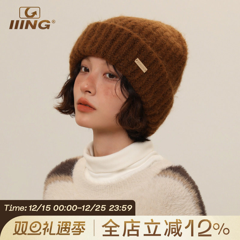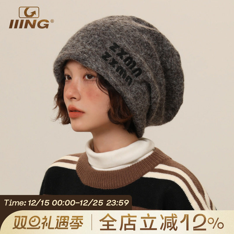 IIING帽控 羊毛混纺字母堆堆帽子女冬季显脸小保暖护耳包头帽冷帽