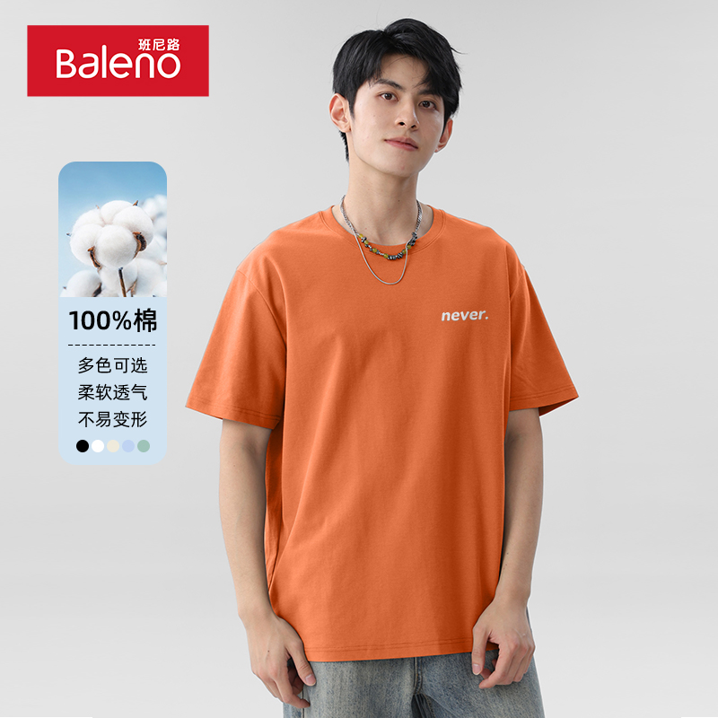 班尼路男士纯棉t恤夏季新款简约风潮牌字母半袖橘色圆领男款短袖