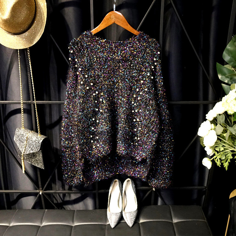 chic女神亮丝闪闪针织衫韩版手工钉珠镂空百搭前短后长显瘦毛衣女