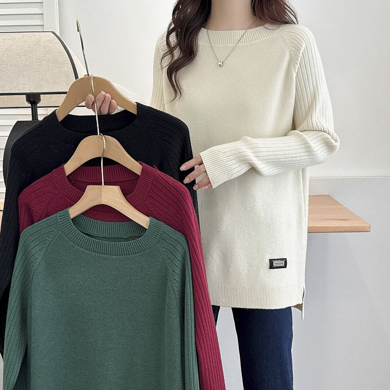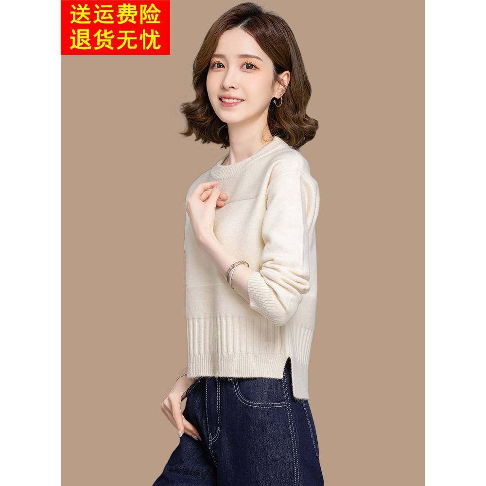 针织衫女2026年春秋季时尚简约纯色圆领套头打底衫弹力前短后长潮