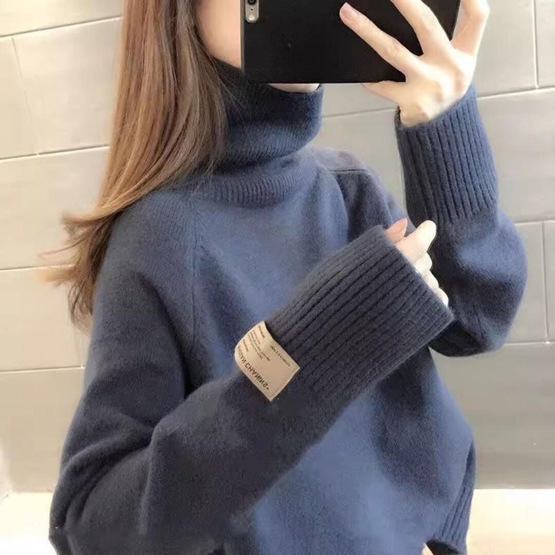秋冬季新款韩版前短后长半高领套头毛衣女宽松外穿学生针织衫加厚