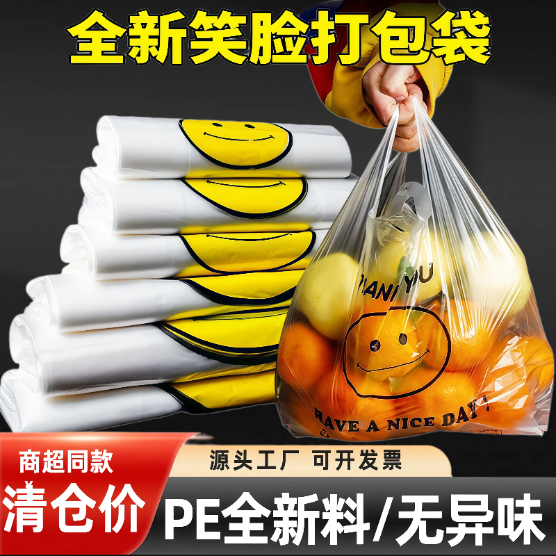 加厚塑料袋笑脸袋透明食品袋打包袋手提超市购物背心方便袋子批发