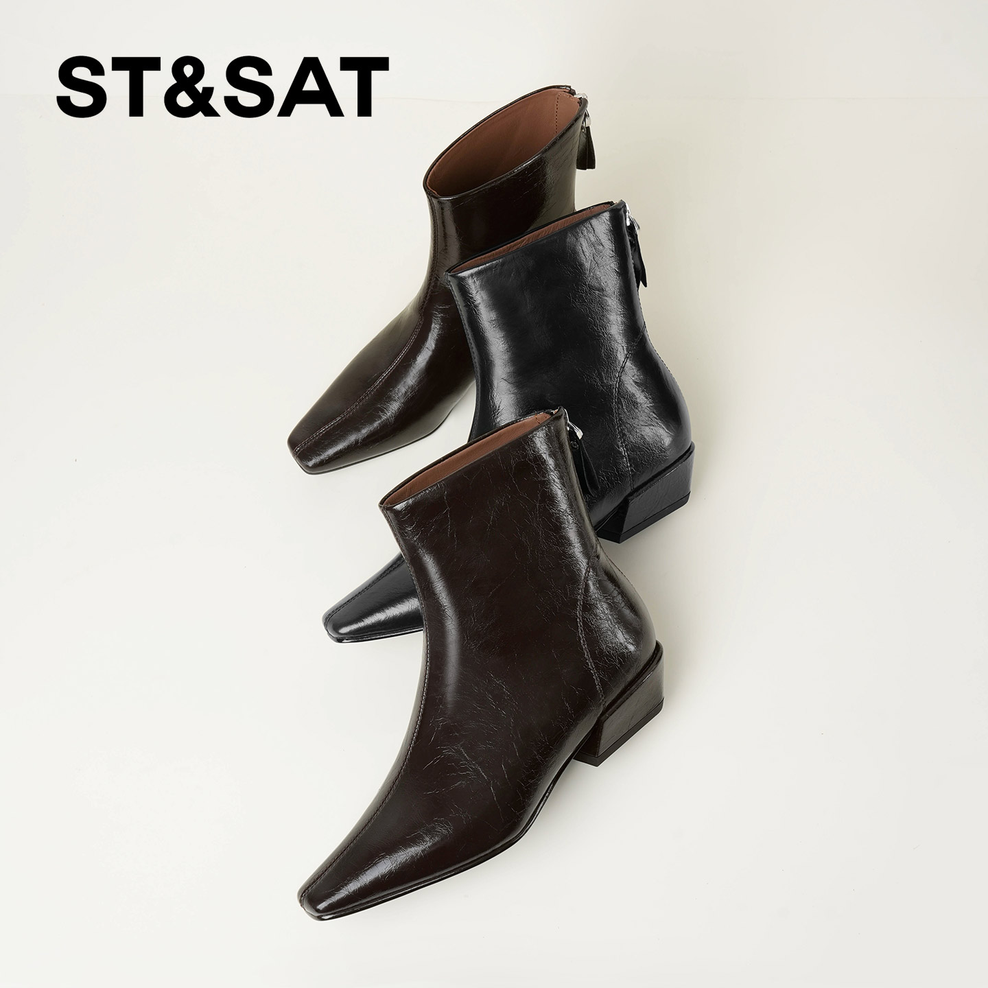 星期六法式短靴女2025秋冬气质方头粗跟高级感裸靴真皮英伦风皮靴