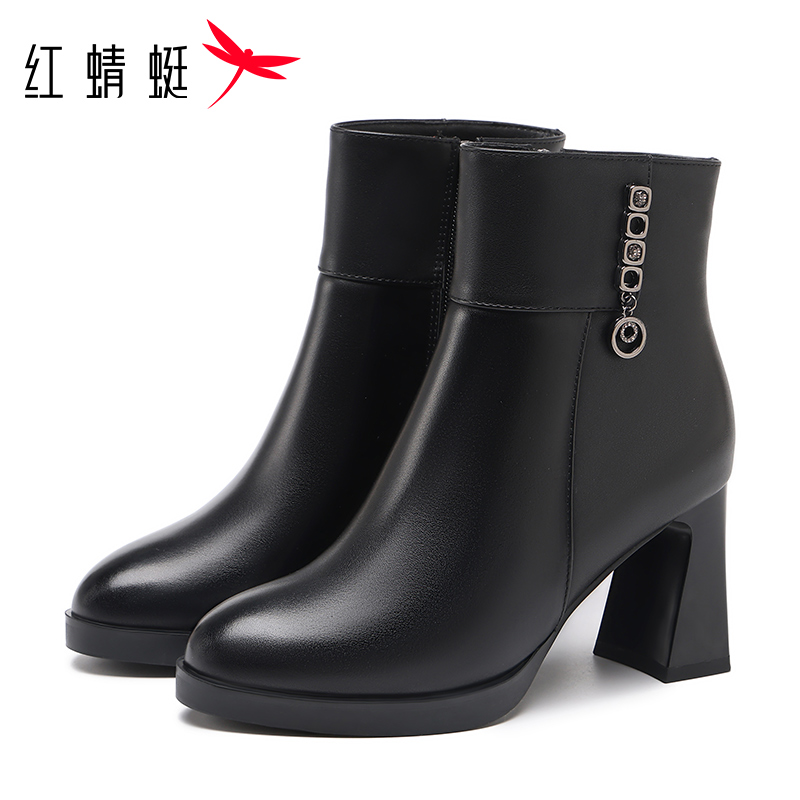 红蜻蜓通勤中筒女皮靴真皮高跟气质短靴粗跟不累脚单靴加绒时装靴