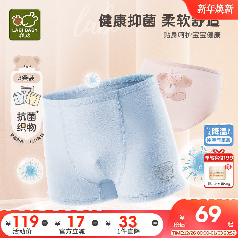 拉比童装25新款女儿童内裤3条装男童三角四角纯棉内裤不夹PP内裤