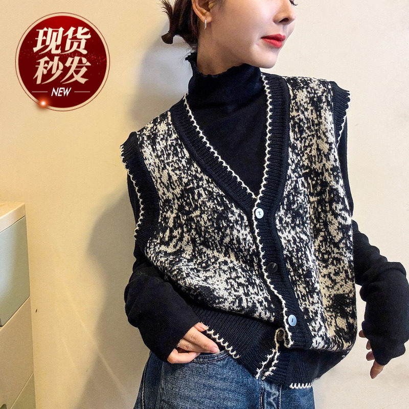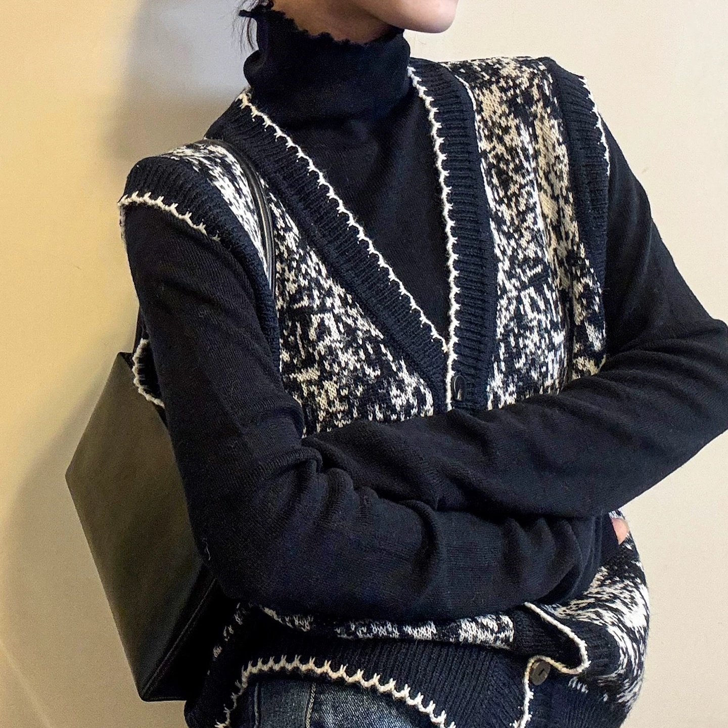 欧洲站高端两件套羊毛马甲背心开衫高领水墨风黑白毛衣上衣针织女