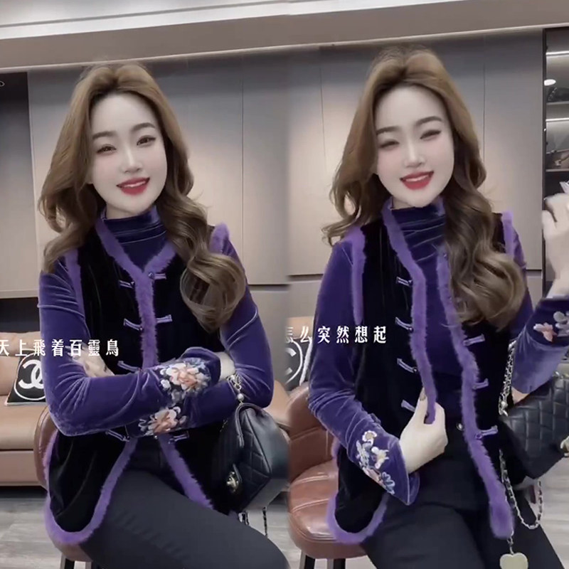 新中式国风高级感两件套女冬季新款复古刺绣设计丝绒小衫盘扣马甲
