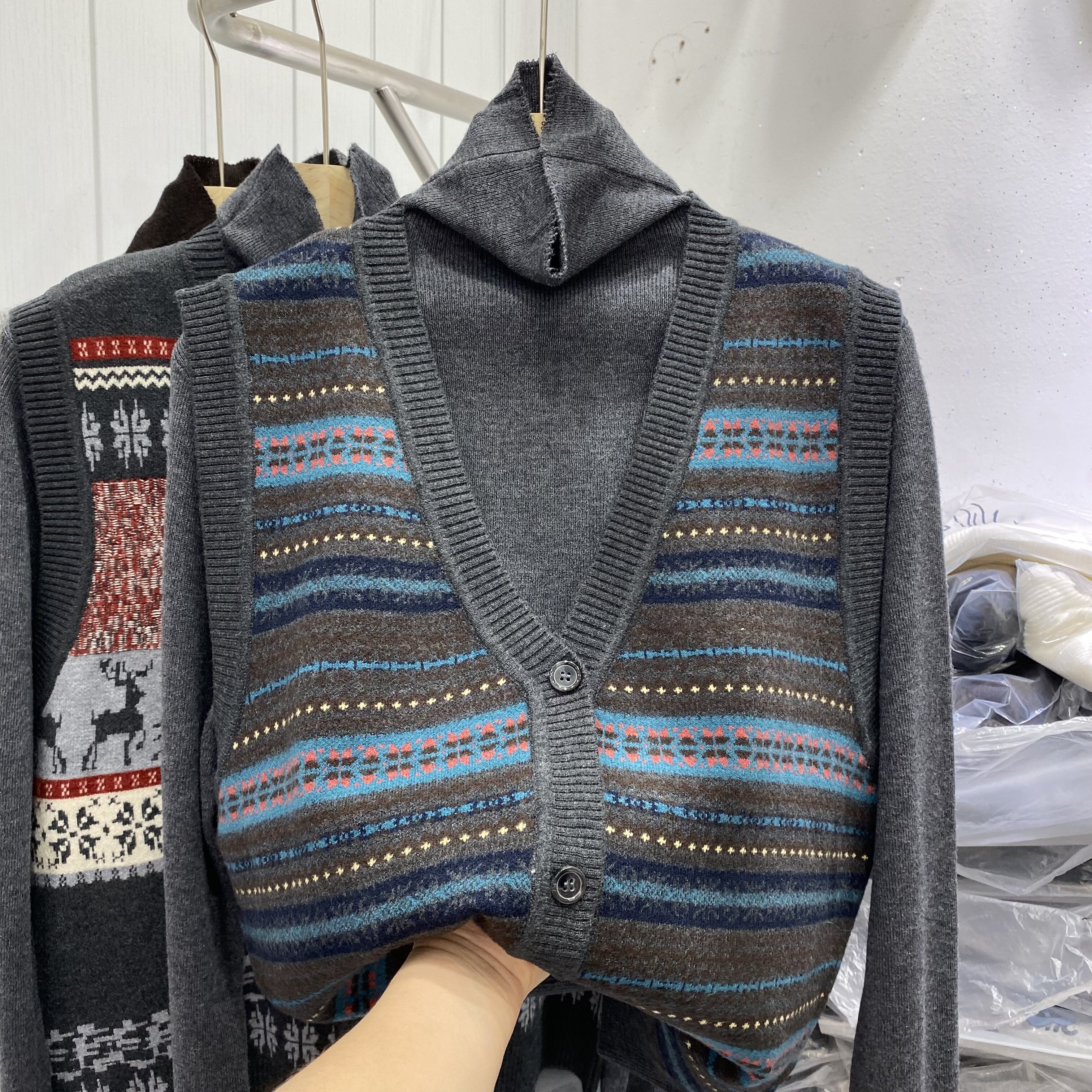 欧洲站条纹圆领针织开衫马甲背心女25冬季叠穿长袖打底衫两件套