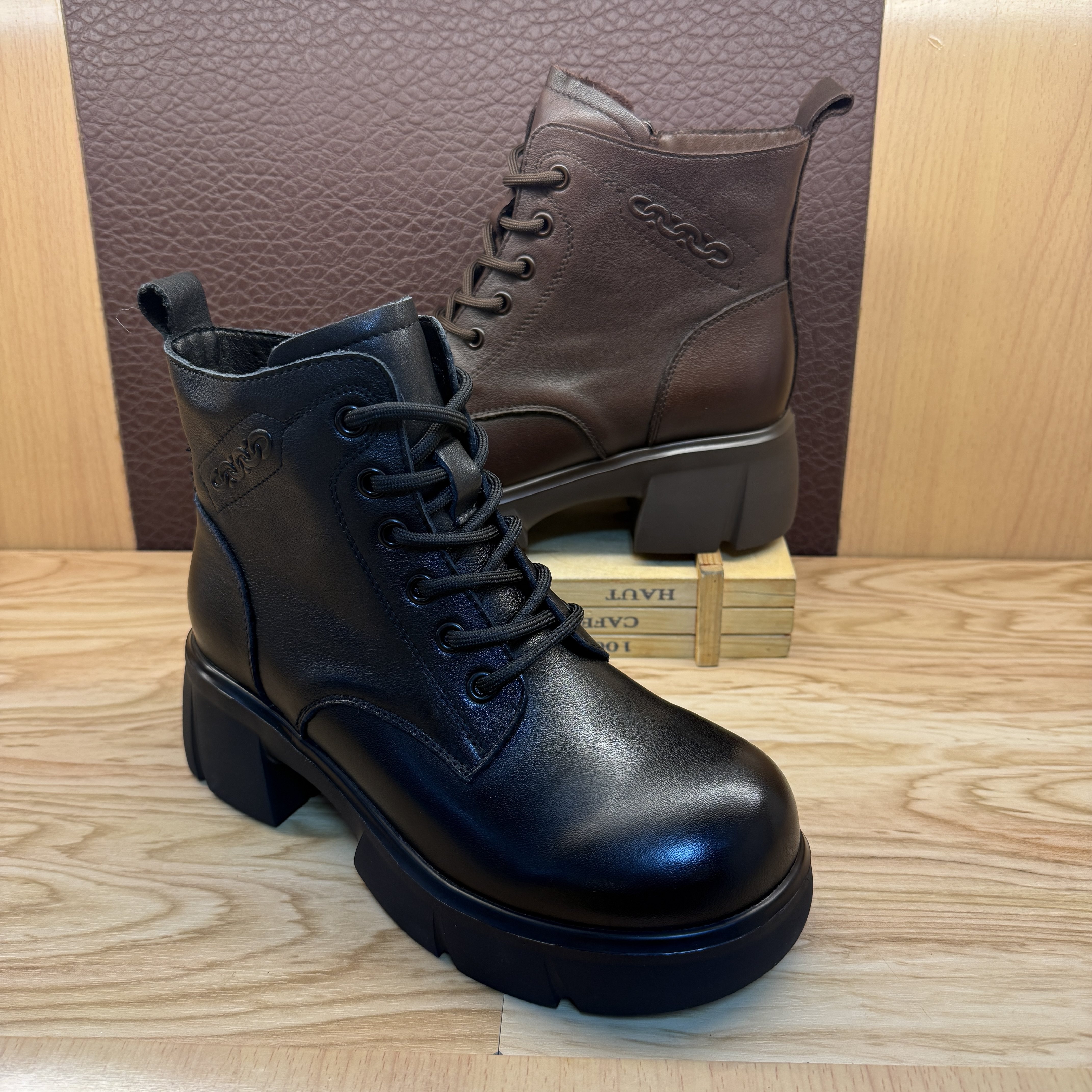 - 系带短靴粗跟马丁靴女真皮