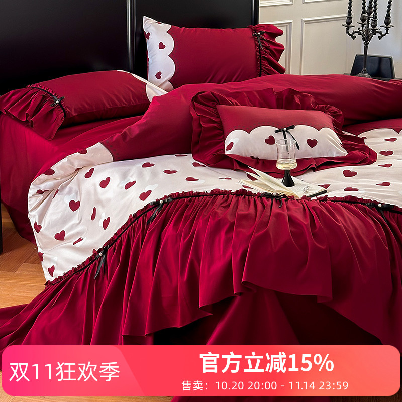 浪漫婚庆100S澳棉全棉四件套少女心爱心结婚被套红色床上用品1.8m