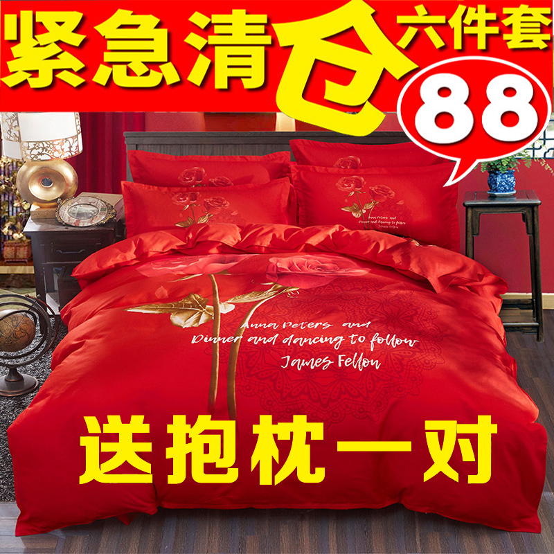 欧式贡缎婚庆四件套大红色1.8M结婚床上用品新婚礼六件套刺绣床品