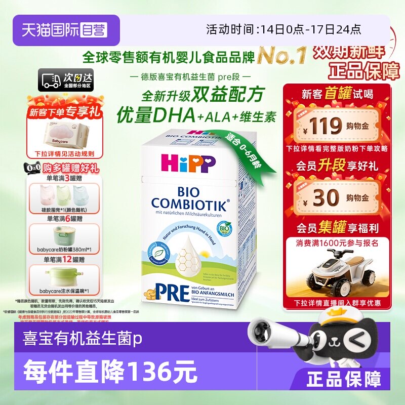 HiPP喜宝 德国经典有机婴幼儿配方进口奶粉Pre段(0-6个月)官方