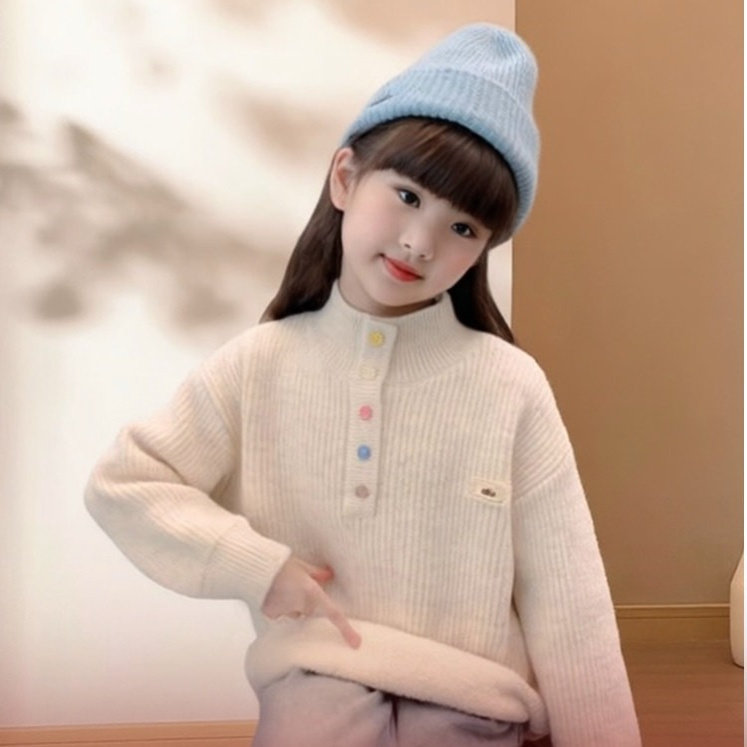 微衣丽人韩版女童彩虹纽扣高领一体绒毛衣套头秋冬加厚针织衫洋气