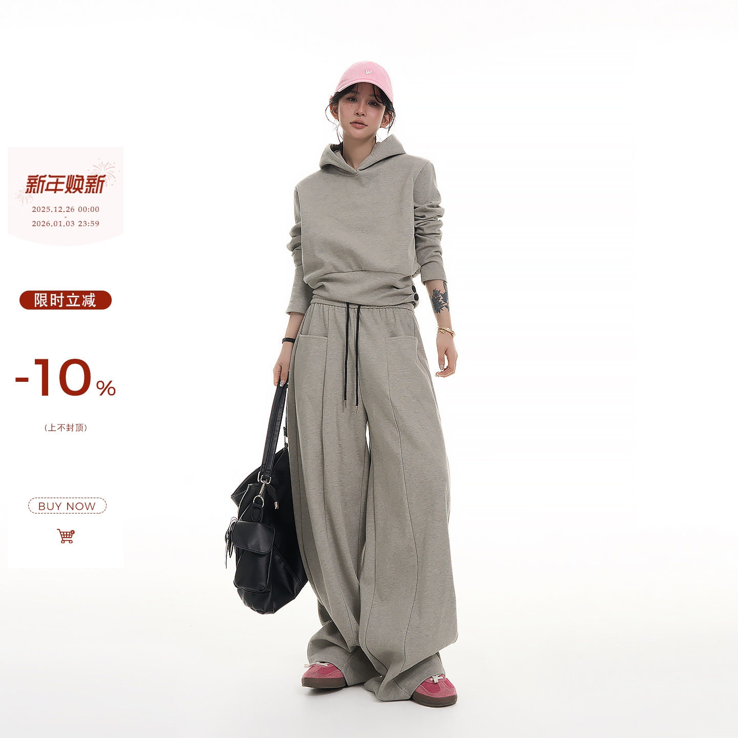 吴童童设计感收腰连帽长袖卫衣女秋冬韩系高级感修身上衣长裤套装