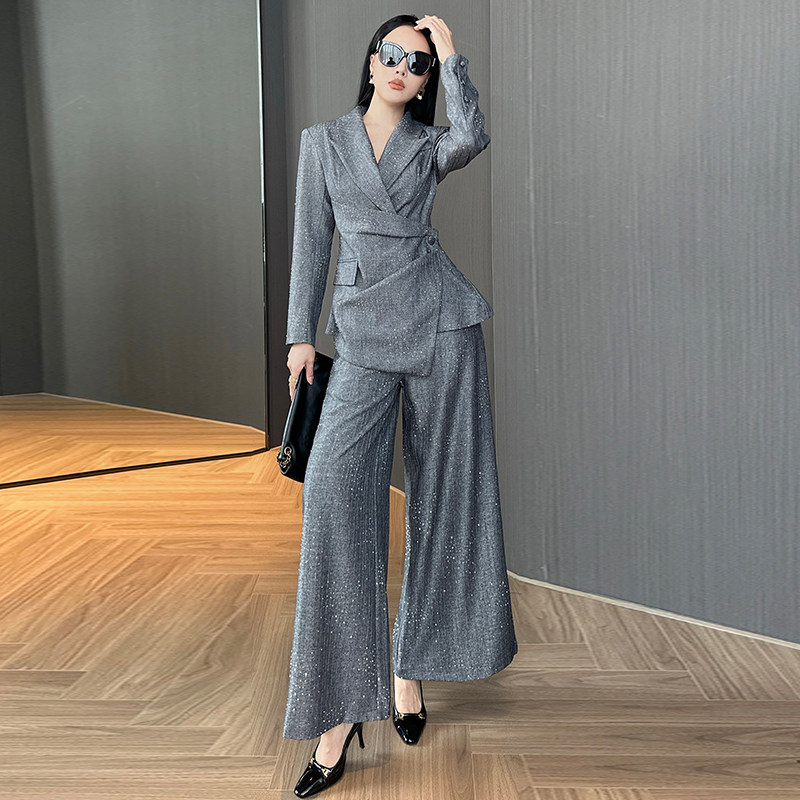 时尚拼色荷叶边修身长袖西装高腰阔腿长裤重要场合漂亮套装女秋冬