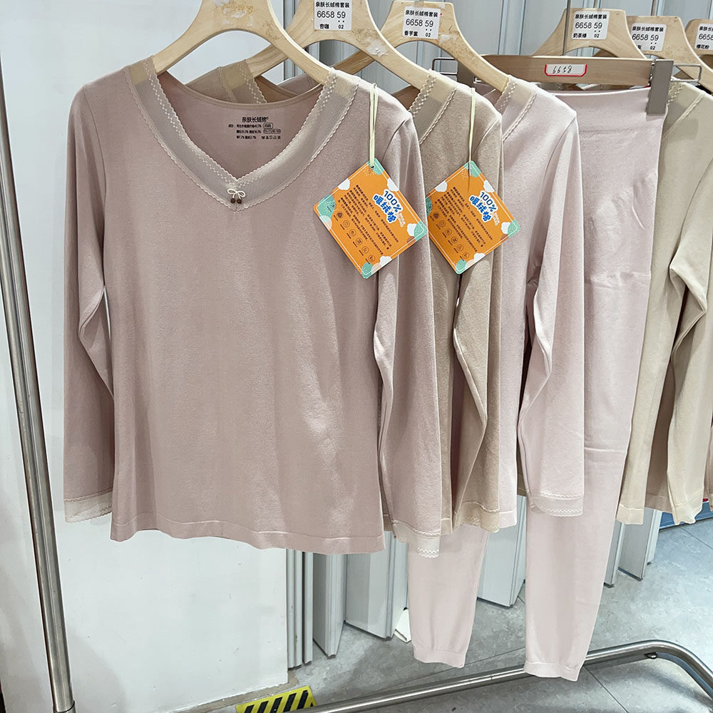 秋冬新款长绒棉V领长袖长裤保暖内衣套装女美体修身打底秋衣秋裤