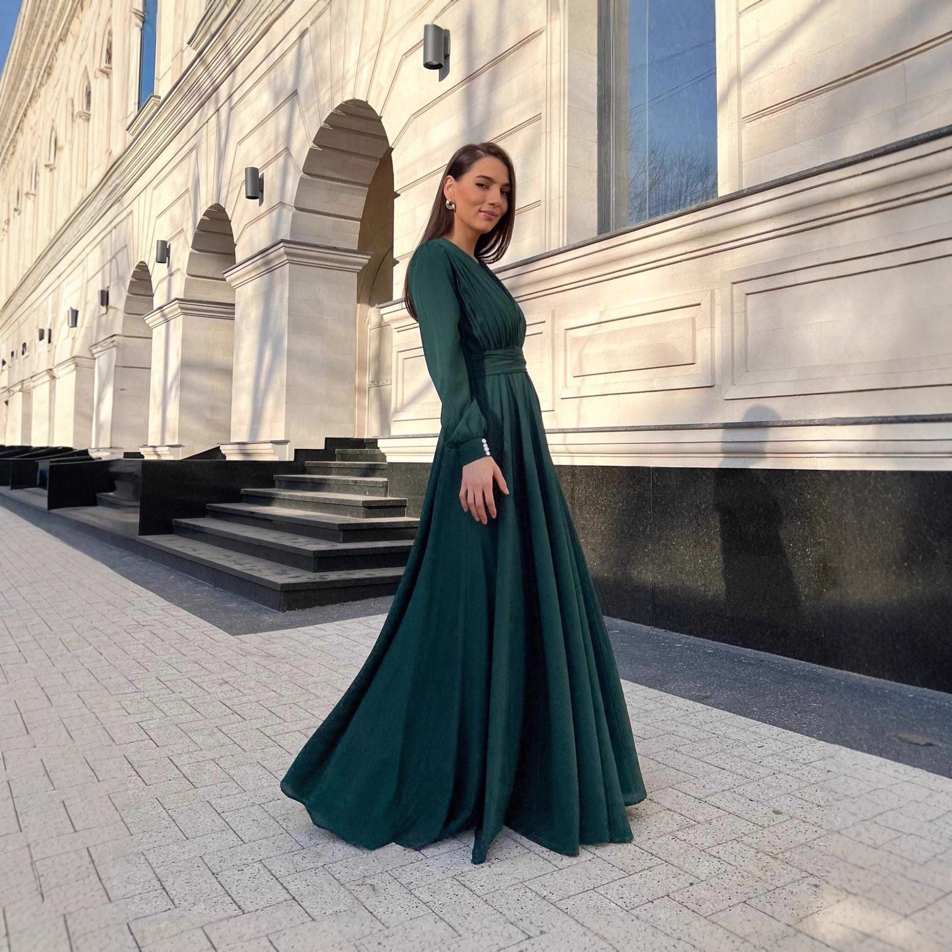 欧美外贸女装新款亚马逊气质优雅长袖大摆雪纺秋冬连衣裙V领批发