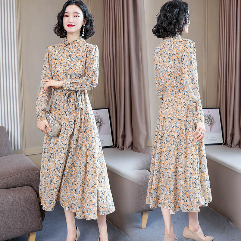 长袖雪纺连衣裙女秋冬装显瘦收腰绑带气质长款大码方领碎花衬衫裙