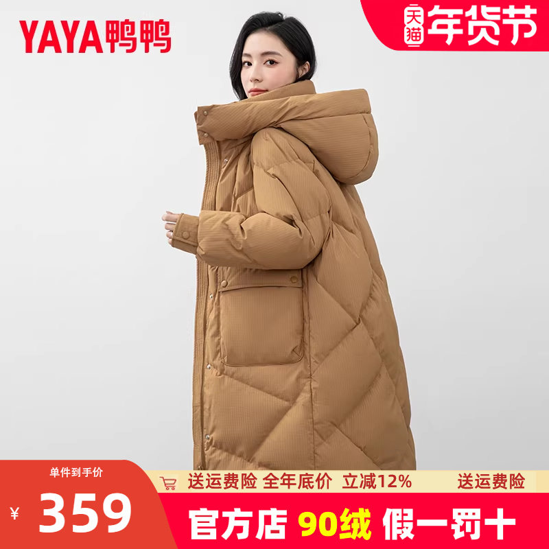 鸭鸭羽绒服女士2025年冬新款过膝中长款加厚宽松连帽鸭绒休闲外套