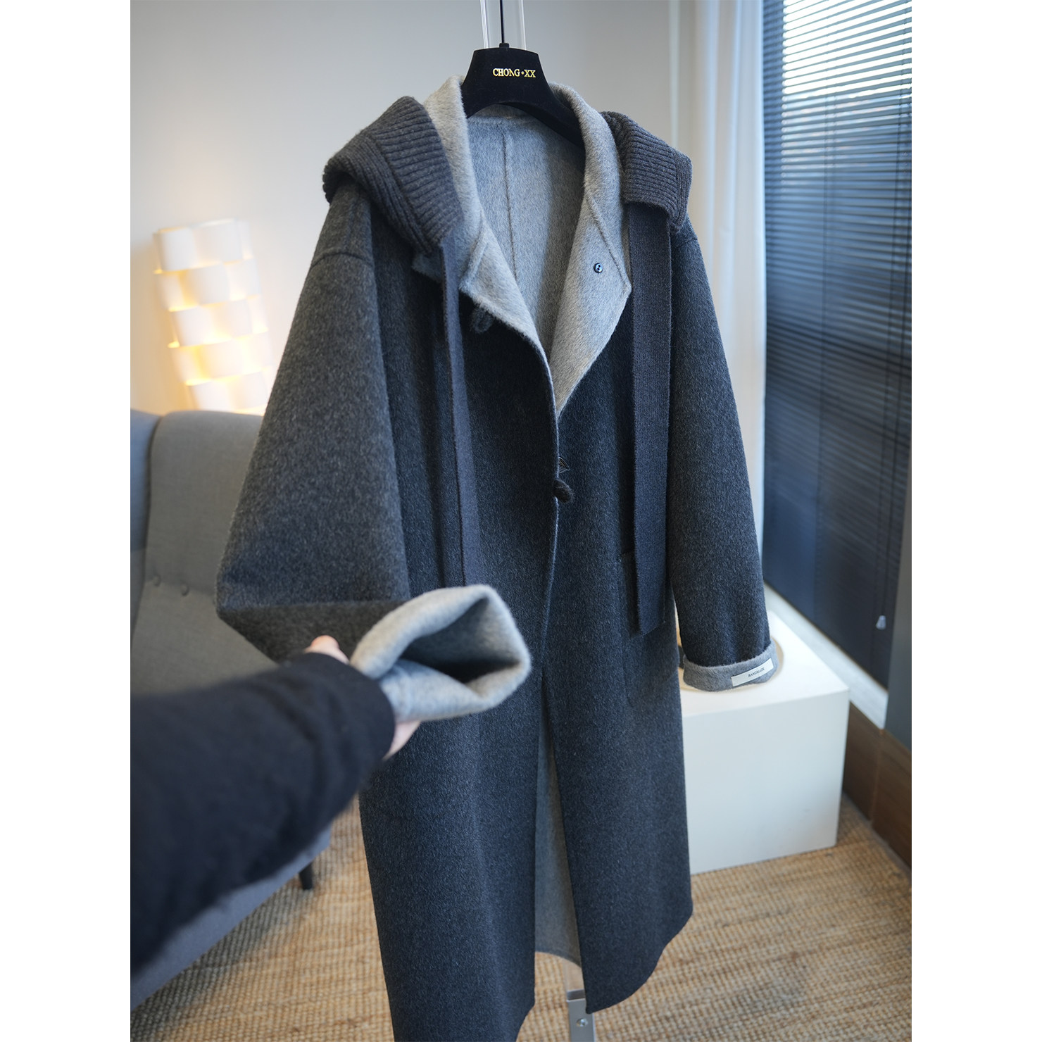 绵羊毛混纺千鸟格连帽双排扣中长款双面呢大衣长袖女毛呢外套Q040