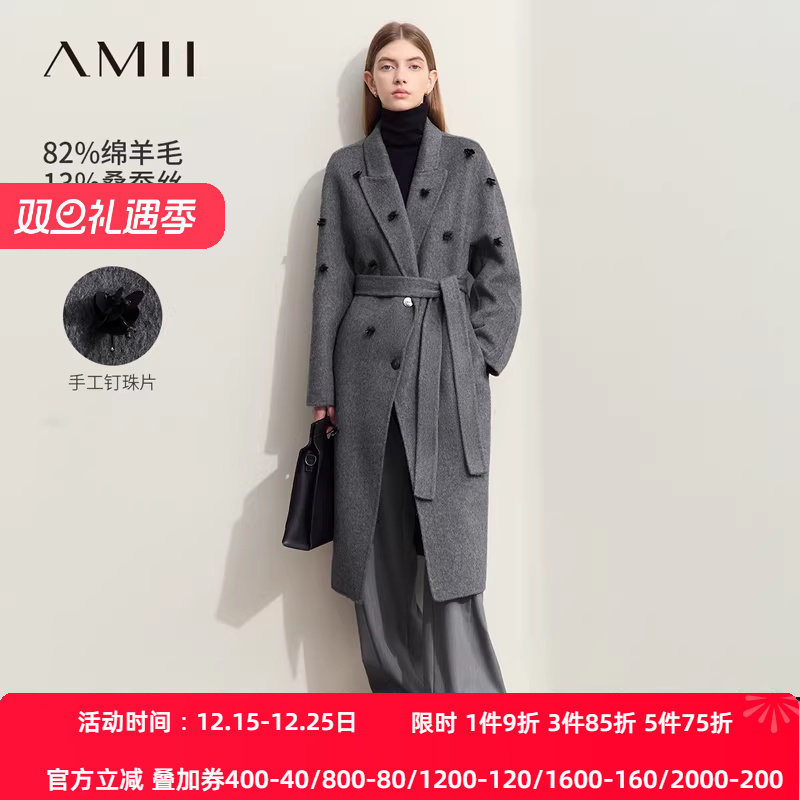 Amii2025冬新款手工钉珠片配腰带羊毛驼绒双面呢大衣女毛呢外套