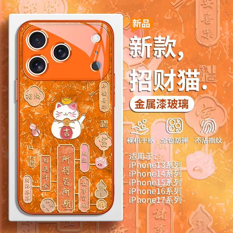 适用苹果16promax手机壳15pro新款14可爱13mini玻璃12/11全包8新年7plus招财猫6splus国风女xr防摔xs保护se3