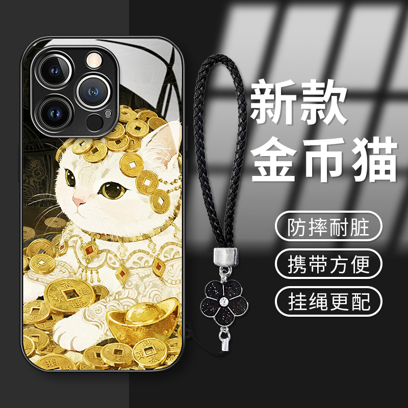 金币招财猫适用苹果16手机壳iPhone15Promax新款IP14玻璃可爱硬13简约12女11好看金属漆8plus防摔6保护套7