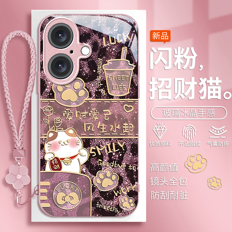 适用招财猫挂绳17AIR苹果16E手机壳iPhone15promax外14plus玻璃13mini专用12女11防摔保护套xr全包xsmax新款6