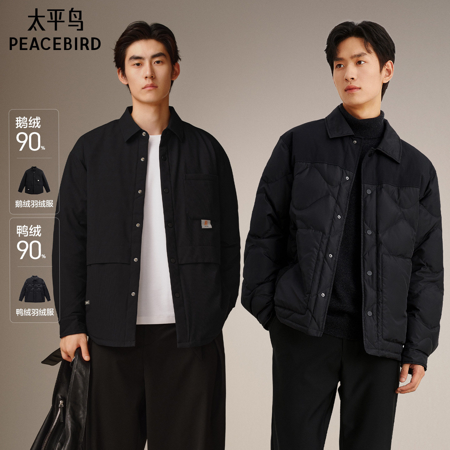 太平鸟男装 衬衫式羽绒服男黑色冬季防寒服宽松翻领保暖夹克外套