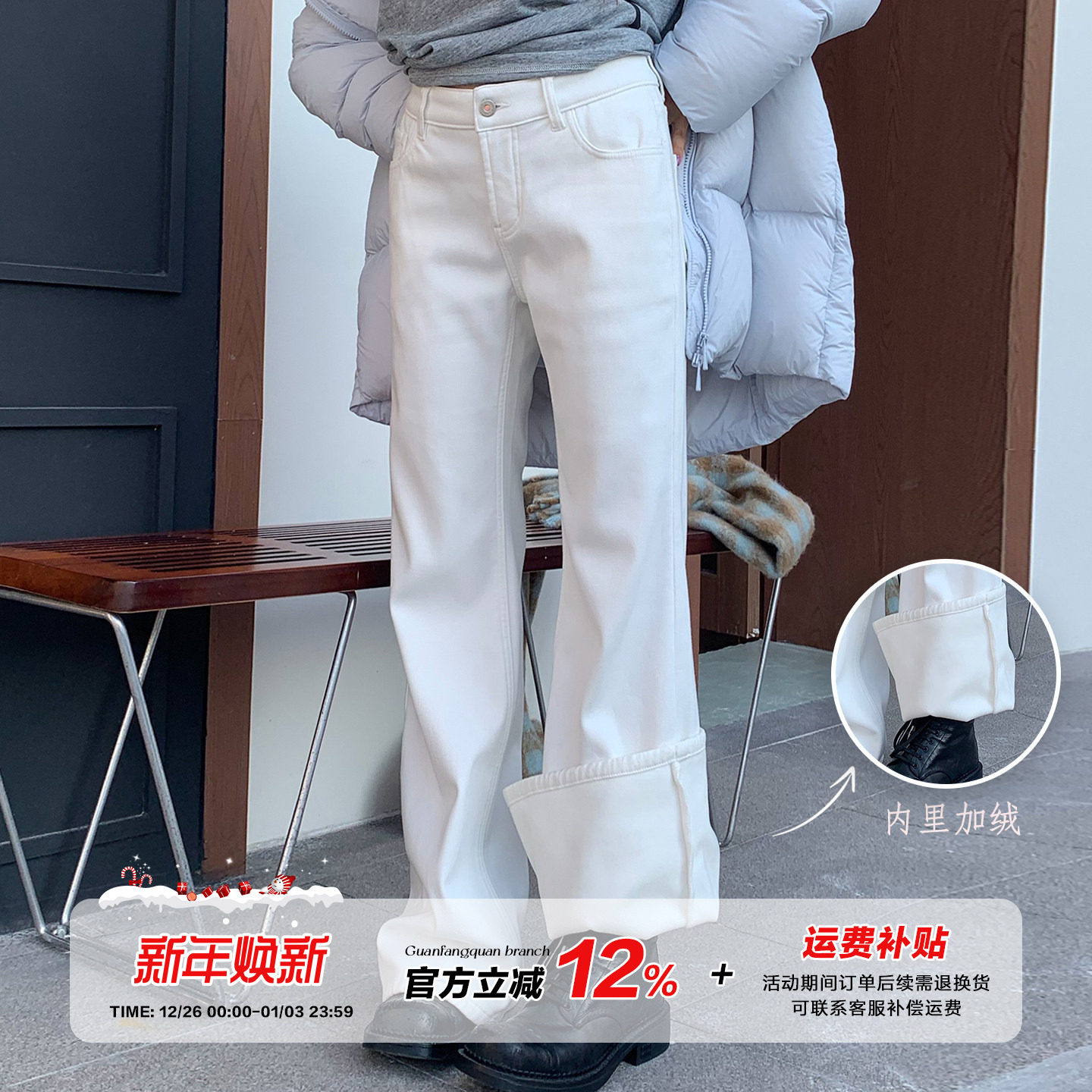 白色加绒加厚不贴腿微喇叭牛仔裤女2025新款冬季低腰小个子直筒裤