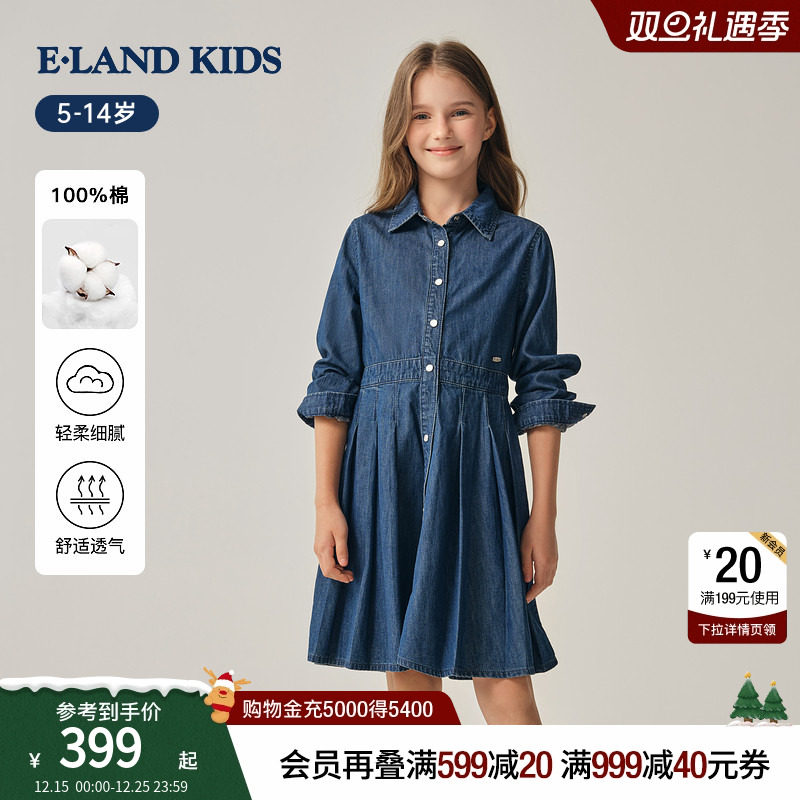 【100%棉】eland kids衣恋童装女童连衣裙2025秋冬新品牛仔百褶裙