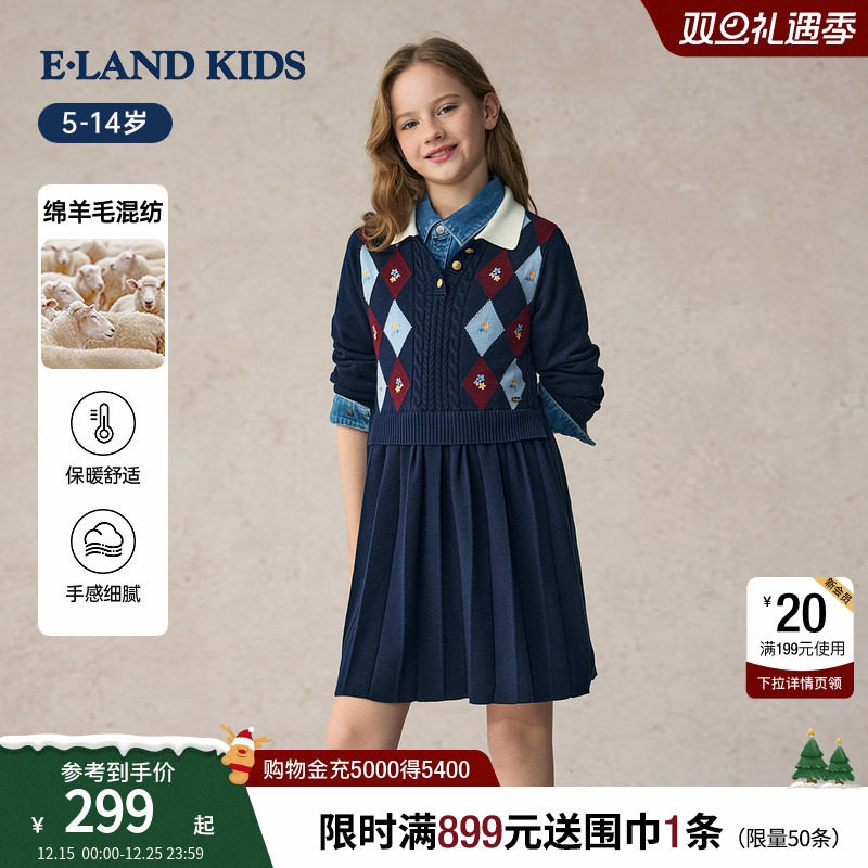 eland kids衣恋童装女童连衣裙2025年冬季新羊毛混纺针织百褶裙