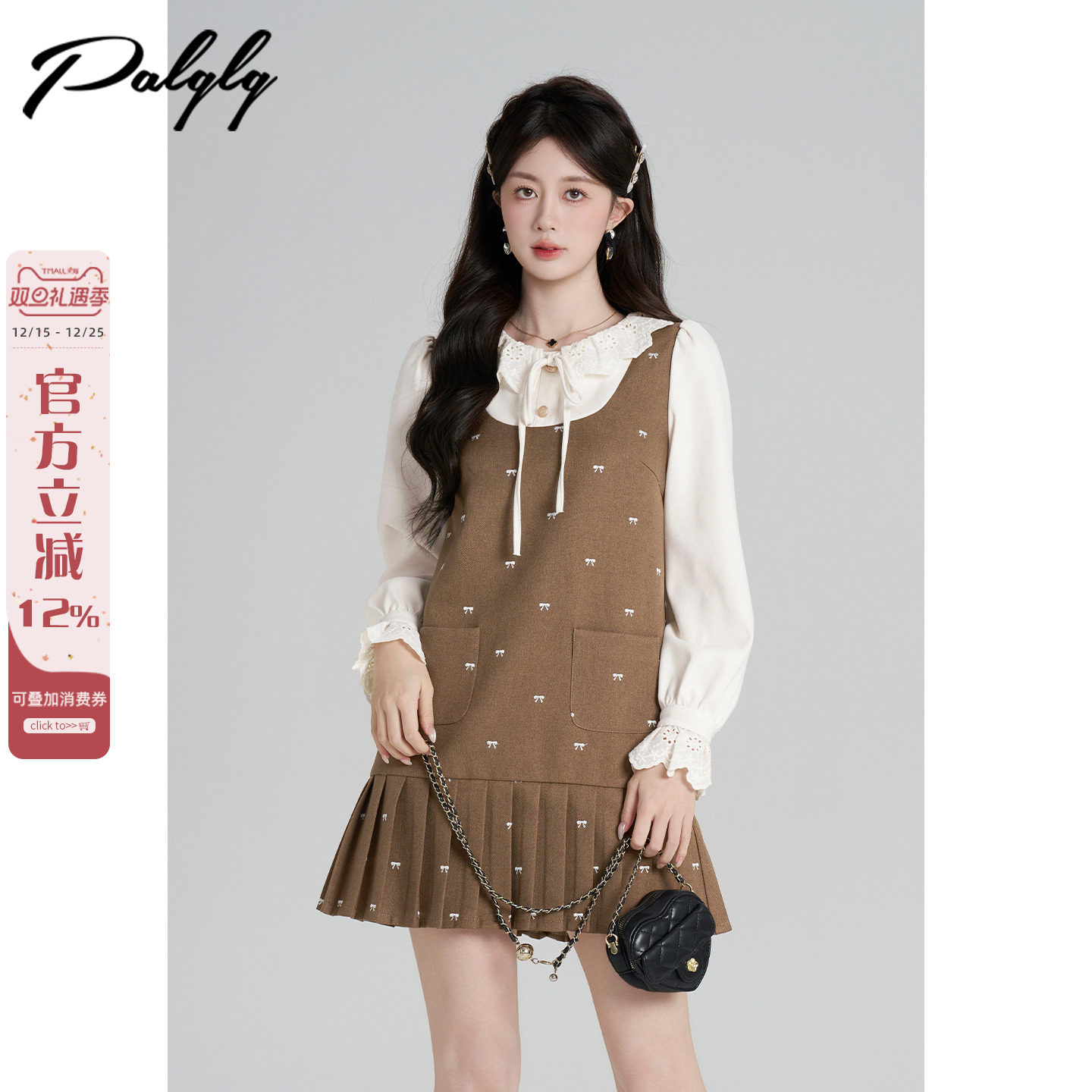Palglg法式荷叶边蕾丝直筒连衣裙女秋冬高级感气质学院风百褶裙子