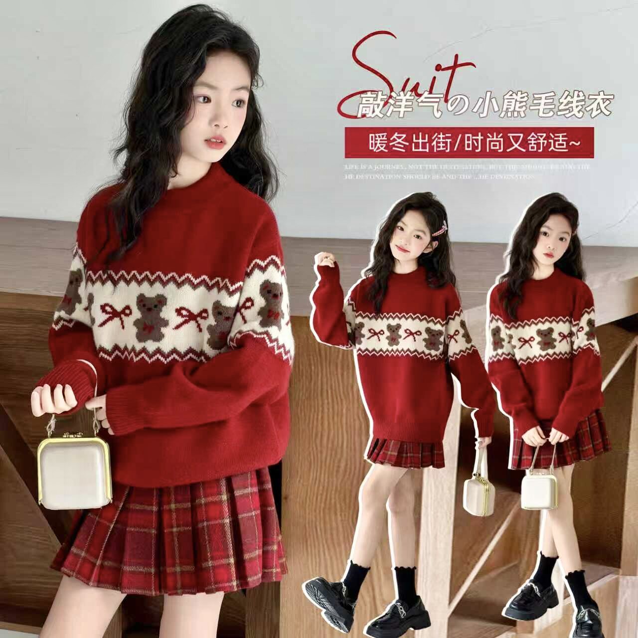 女童小熊毛衣百褶裙套装2025秋冬新款中大童红色拜年服圣诞连衣裙