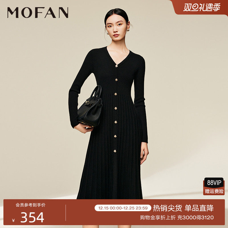黑色优雅绵羊毛V领连衣裙MOFAN摩凡2025秋冬新款荷叶边A字百褶裙