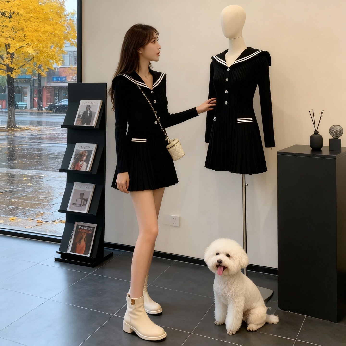 法式黑色海军领针织连衣裙女2025秋冬新款收腰显瘦百褶裙气质减龄