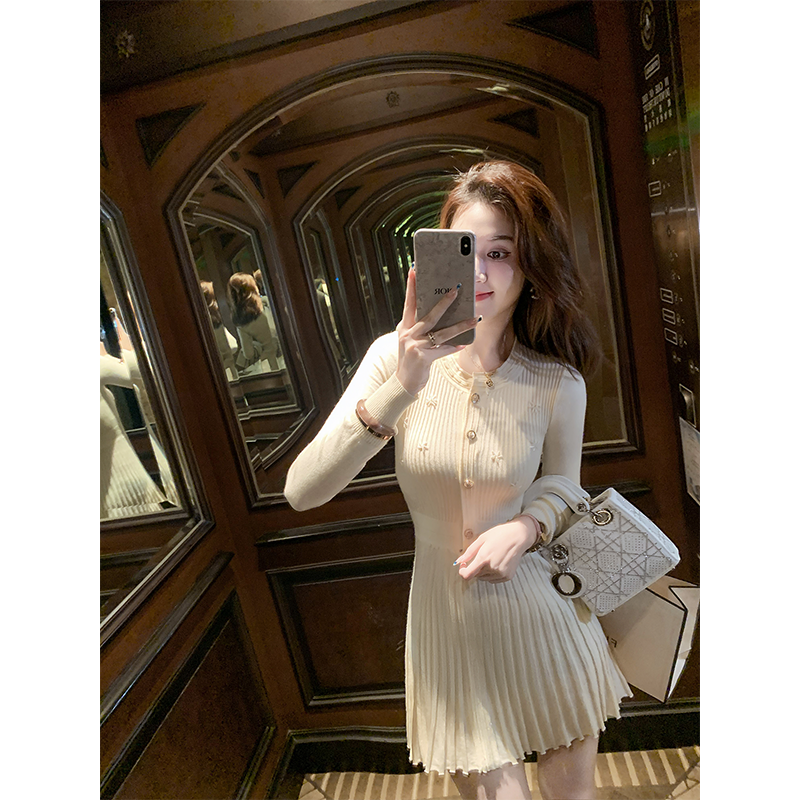 怪力酱 小香风百褶针织连衣裙女秋冬miu系修身收腰长袖内搭毛衣裙